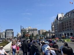 9日目、この研修も後半に入りました。ここから最終日までは、生徒全員で行動を共にします。その初日となるこの日は、早朝からブリティッシュコロンビア州の州都であるビクトリアへ出発です。ビクトリアまでは、バスとフェリーを乗り継ぐ長旅になります。普段なかなか乗る機会のないフェリーでは、生徒たちが船外に出て海上からの景色を満喫する姿や、船内で飲食を楽しむ様子が見られました。ビクトリアに到着後、まずは荘厳な佇まいの州議事堂前で記念撮影です。その後は「花の都」とも称される通り、花と緑あふれる美しいビクトリアの街を自由に散策し、ランチやショッピングを楽しみました。滞在場所から少し離れた街での経験は、生徒たちにとって大きな刺激となったようでした。