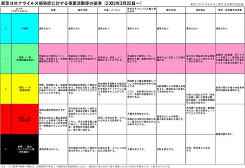 3月22日(火)から本学独自の「新型コロナウイルス感染症に対する事業活動等の基準」における各事業の取扱いを、別紙のとおりレベル「1」といたします。