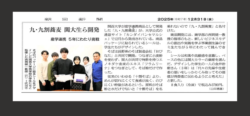 12/31(水)の朝日新聞に西岡ゼミ生開発「 九・九割蕎麦」の記事が掲載されました。