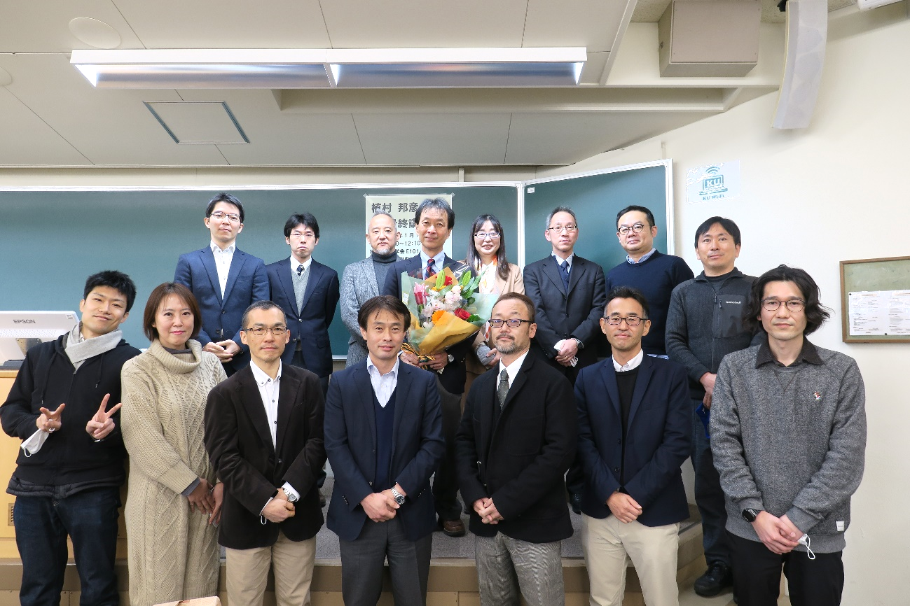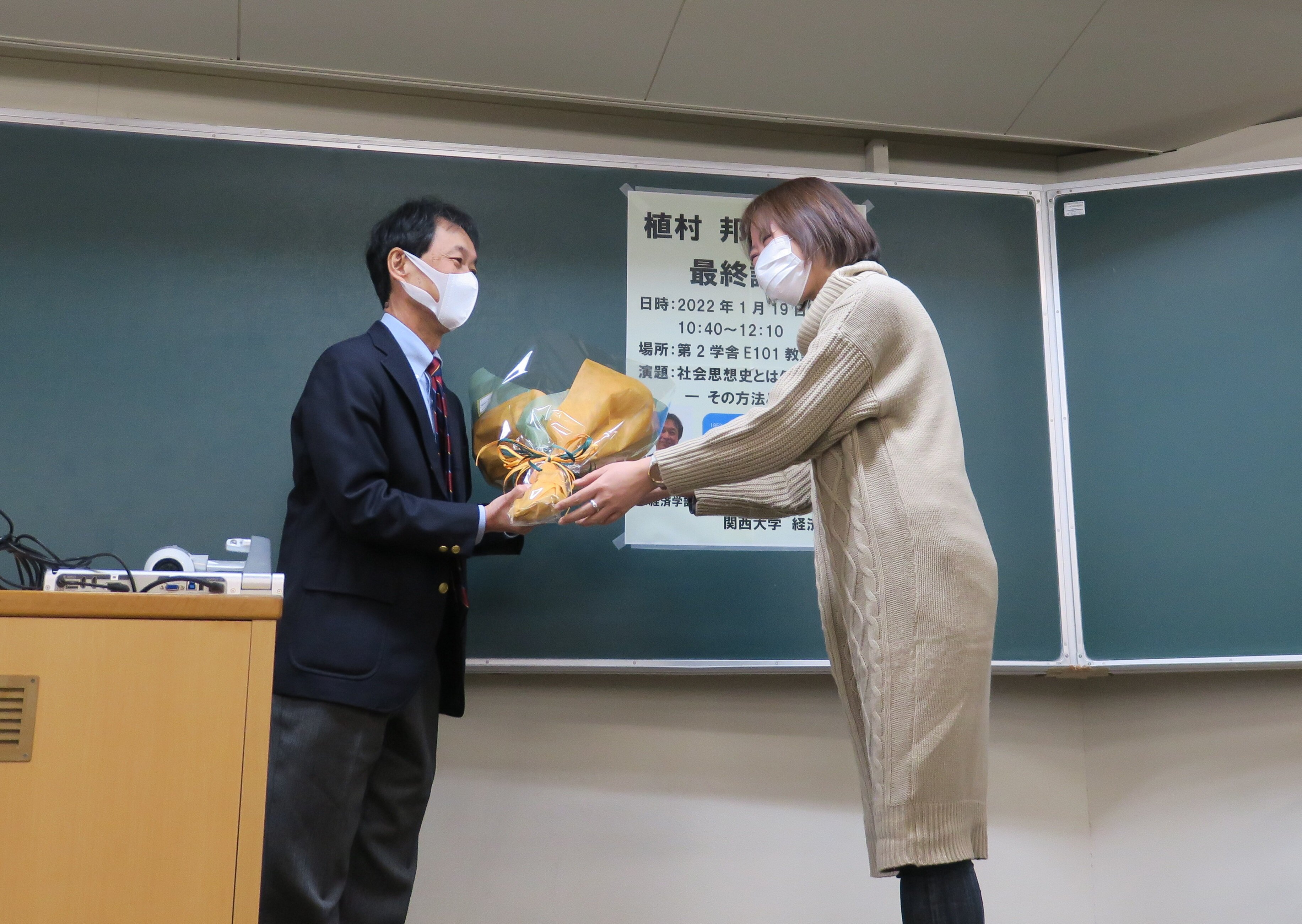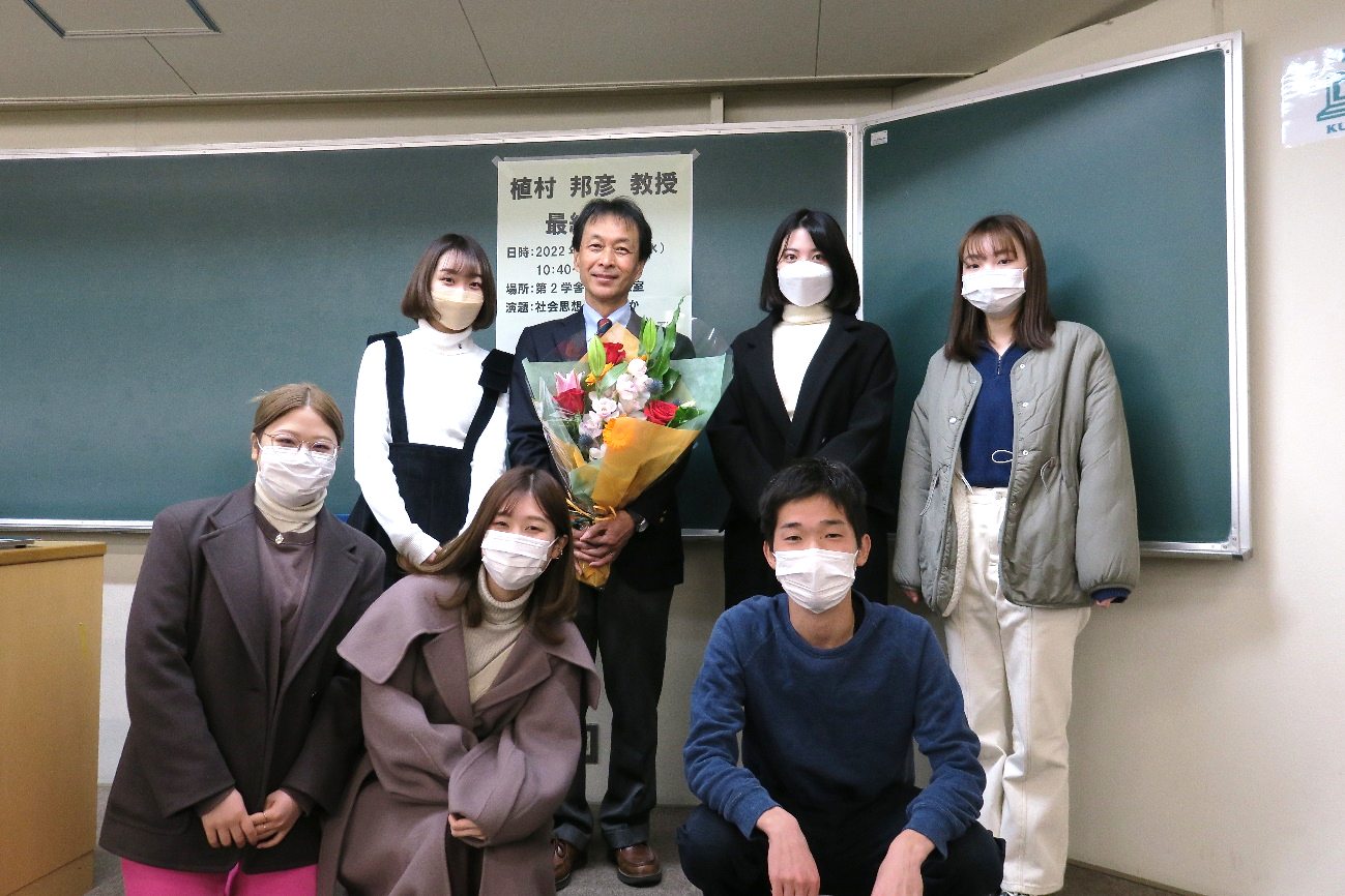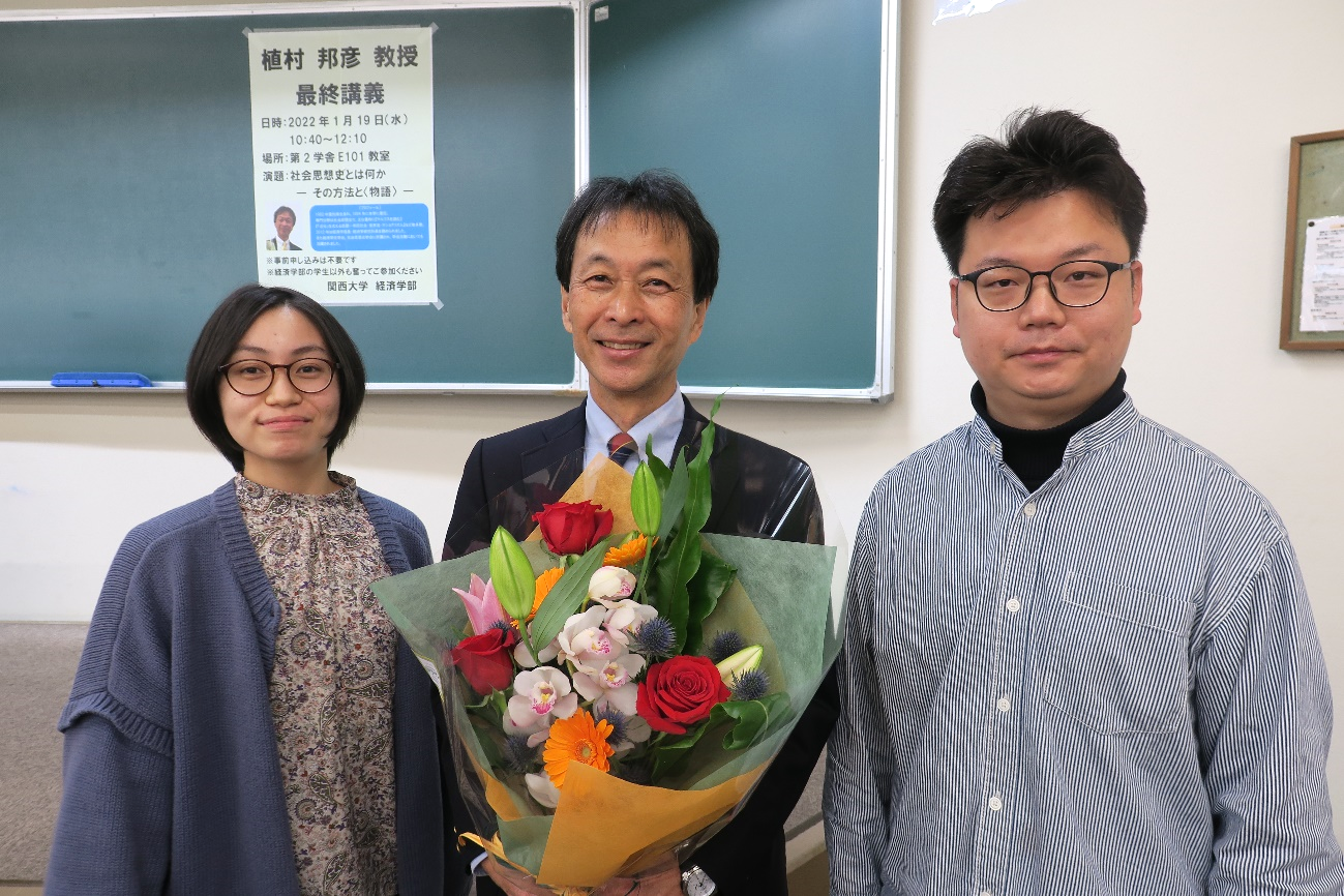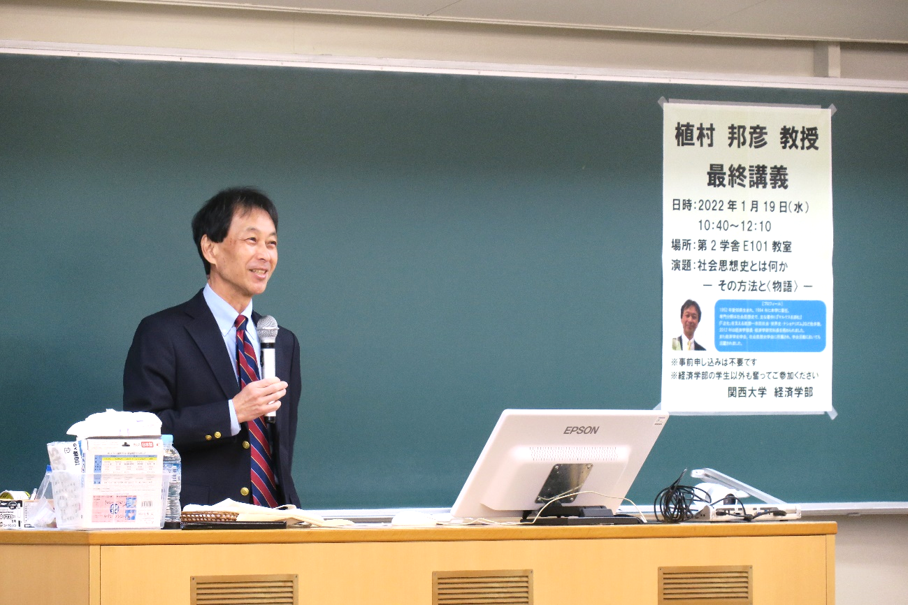 1月19日(水)2時限10時40分より、植村邦彦教授の最終講義が行われました。コロナ禍で、密を避け、広い教室になるべく距離を取りながらですが、多くの人が聴講に訪れました。先生の講義の受講生、ゼミ生、そして卒業生、経済学部から多数の先生方、それだけではなくおそらくは先生の御本の読者の方々が駆け付け、盛会となりました。