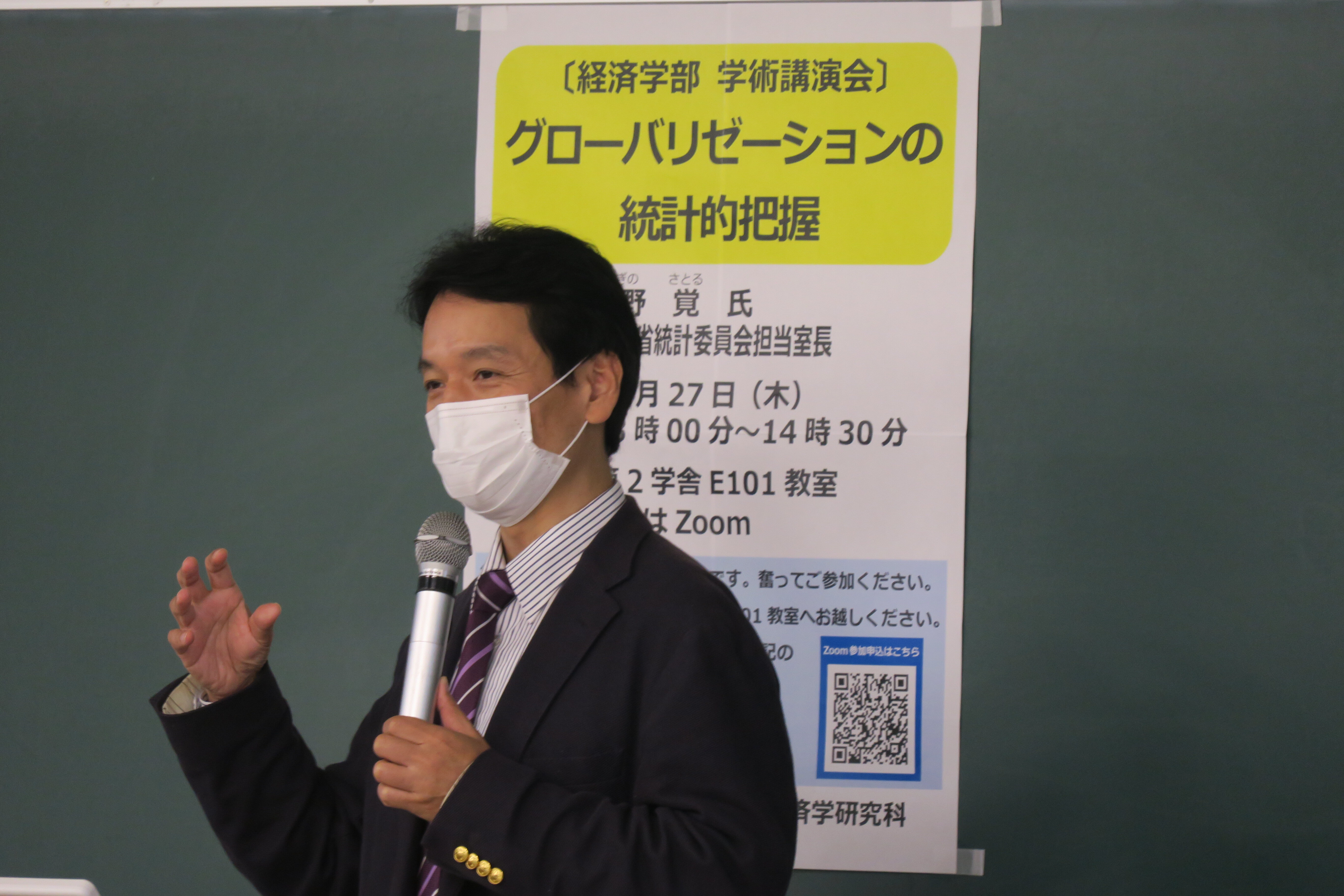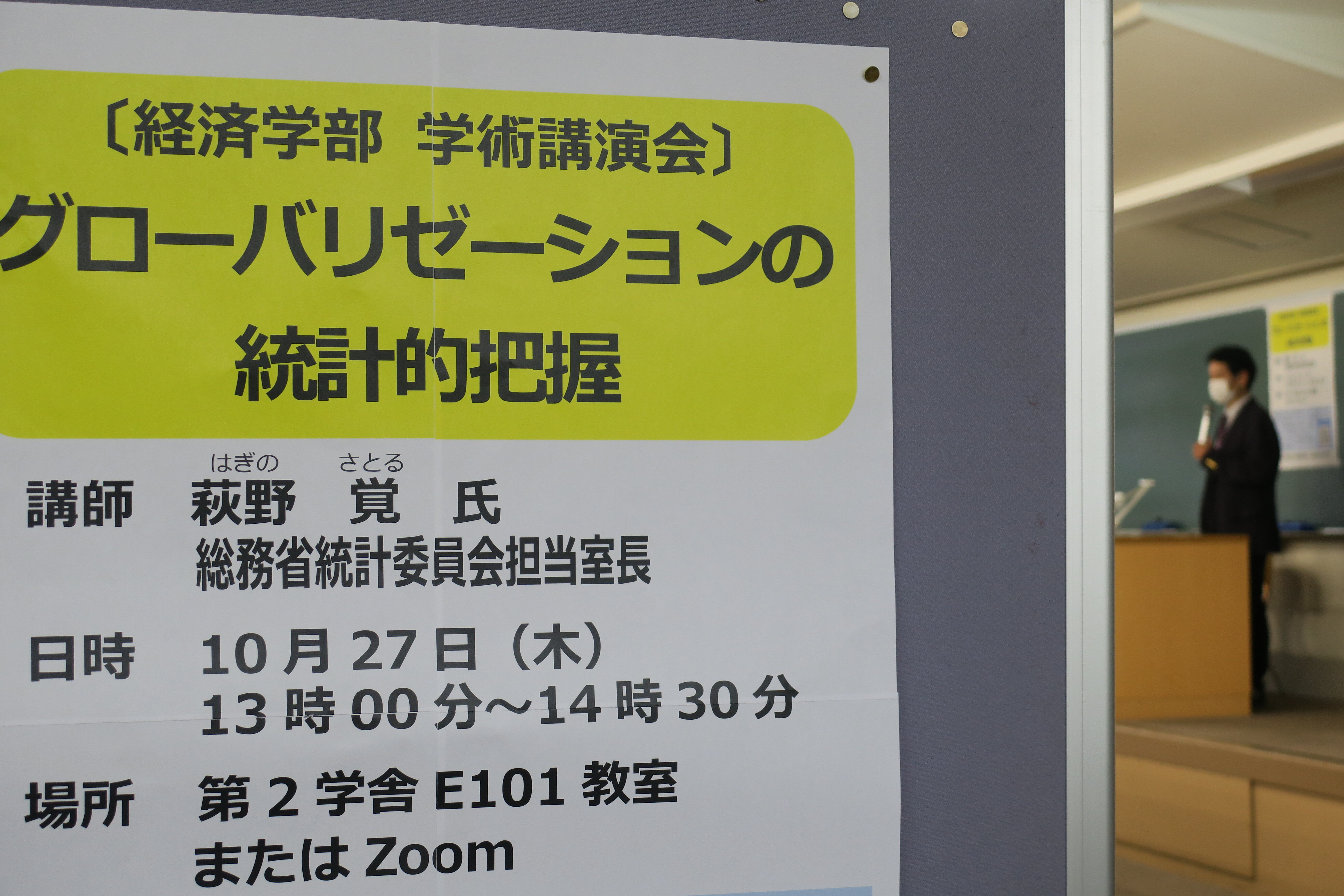 2022年10月27日(木)13時00分~14時30分(第3時限)に 萩野覚氏(総務省統計委員会担当室長)による講演会「グローバリゼーションの統計的把握」を対面およびオンラインのハイブリット方式で開催しました。