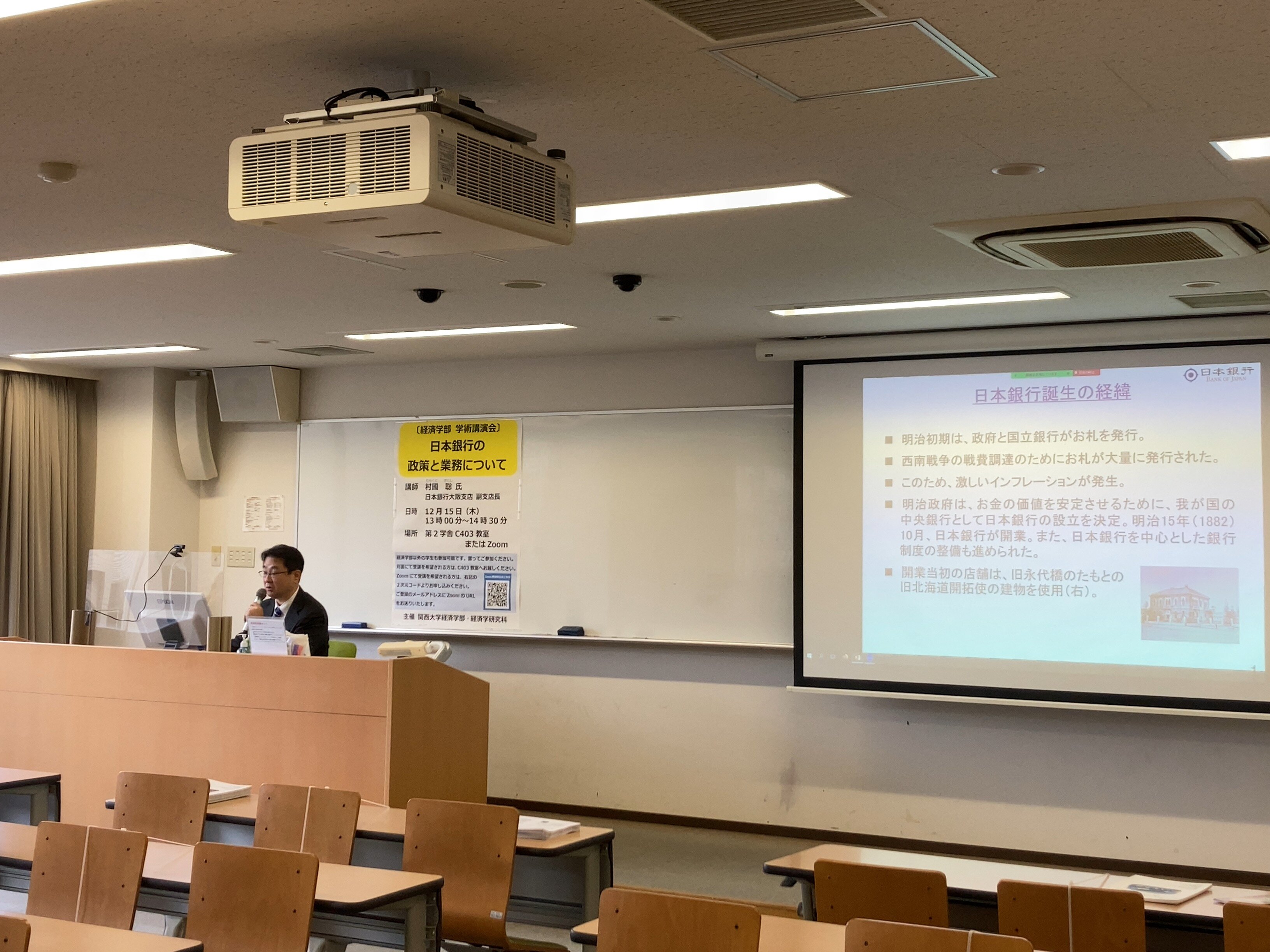 2022年12月15日(木)13時00分~14時30分(第3時限)に 村國聡氏(日本銀行大阪支店 副支店長)による講演会「日本銀行の政策と業務について」を対面とオンラインで開催しました。講演は、日銀誕生の経緯や目的から始まり、決済手段のあり方、物価の動向や世界経済から見る日本経済、関西経済について、さまざまな角度から現在の日本の経済状況を分析し解説いただきました。