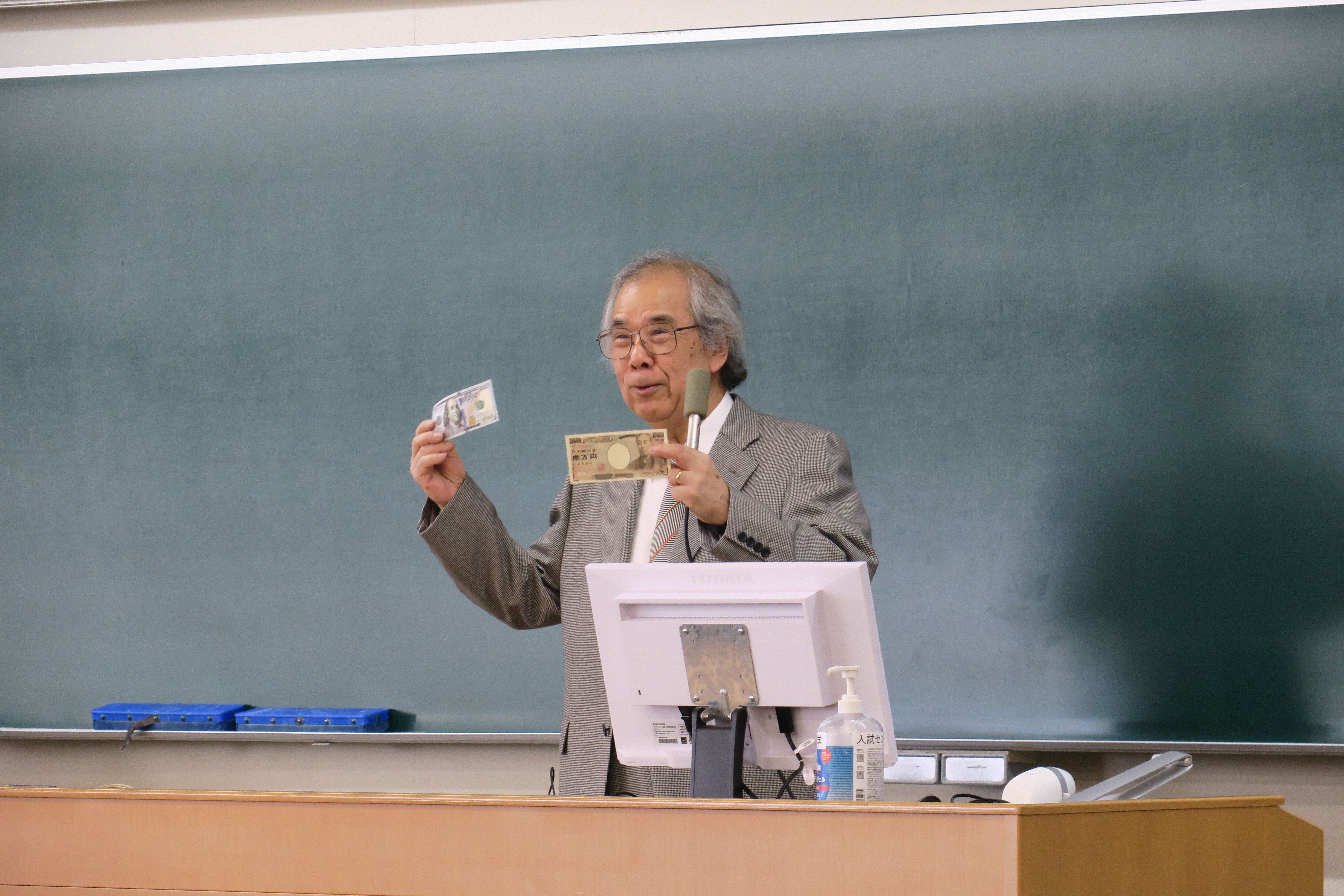 最後に、「やればできる」経済学部生を激励され、これからの人生において、「経済学のメガネ」だけでなく、「家族を大切にするメガネ」を持ってほしいとエールをおくられました。
