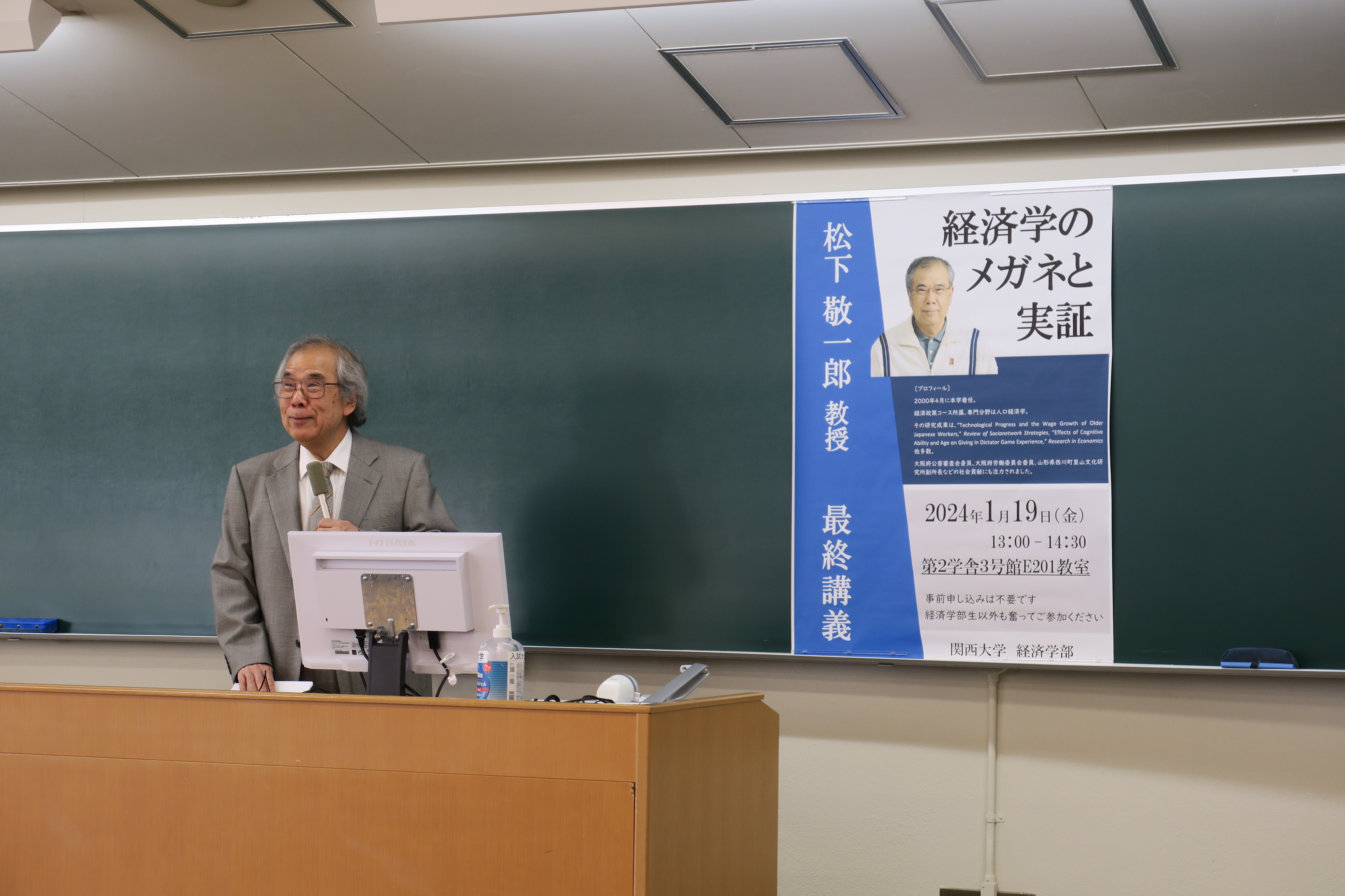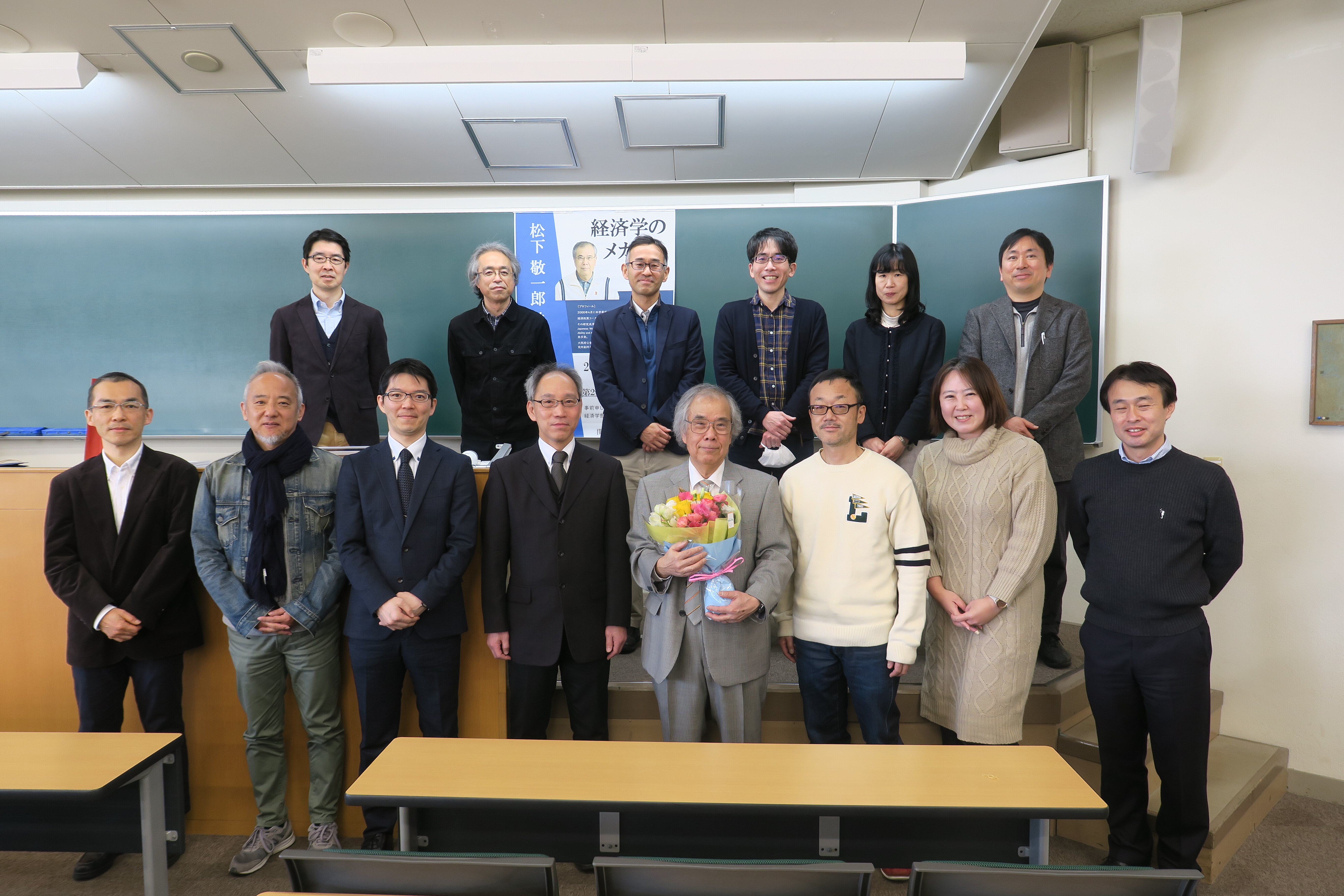 2024年1月19日(金)3限に、松下敬一郎先生の最終講義が行われました。受講学生に加えて、多くの経済学部並びに松下先生と親交のある他学部、他大学の先生も出席され、温かい雰囲気の中で講義が進められました。