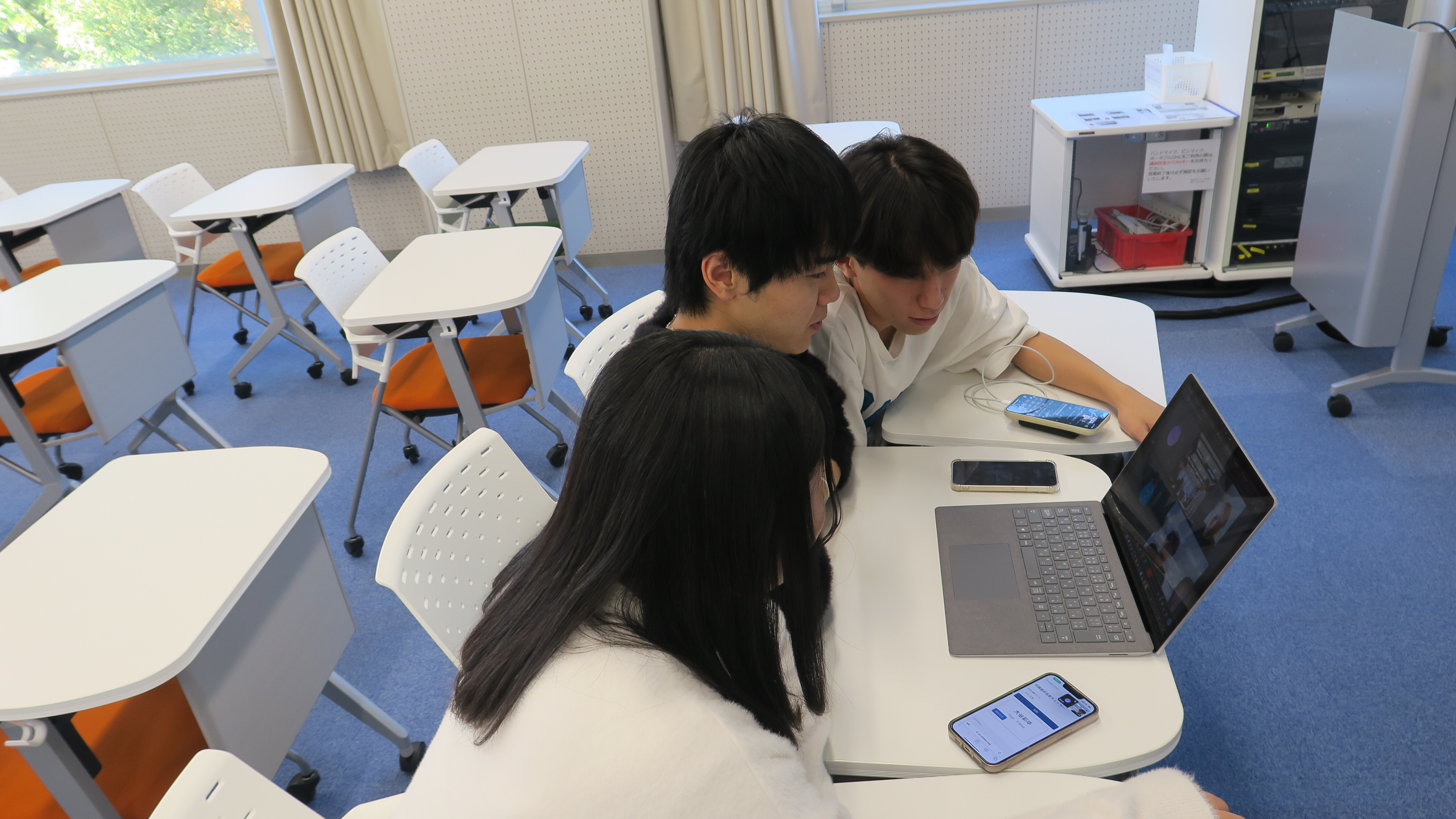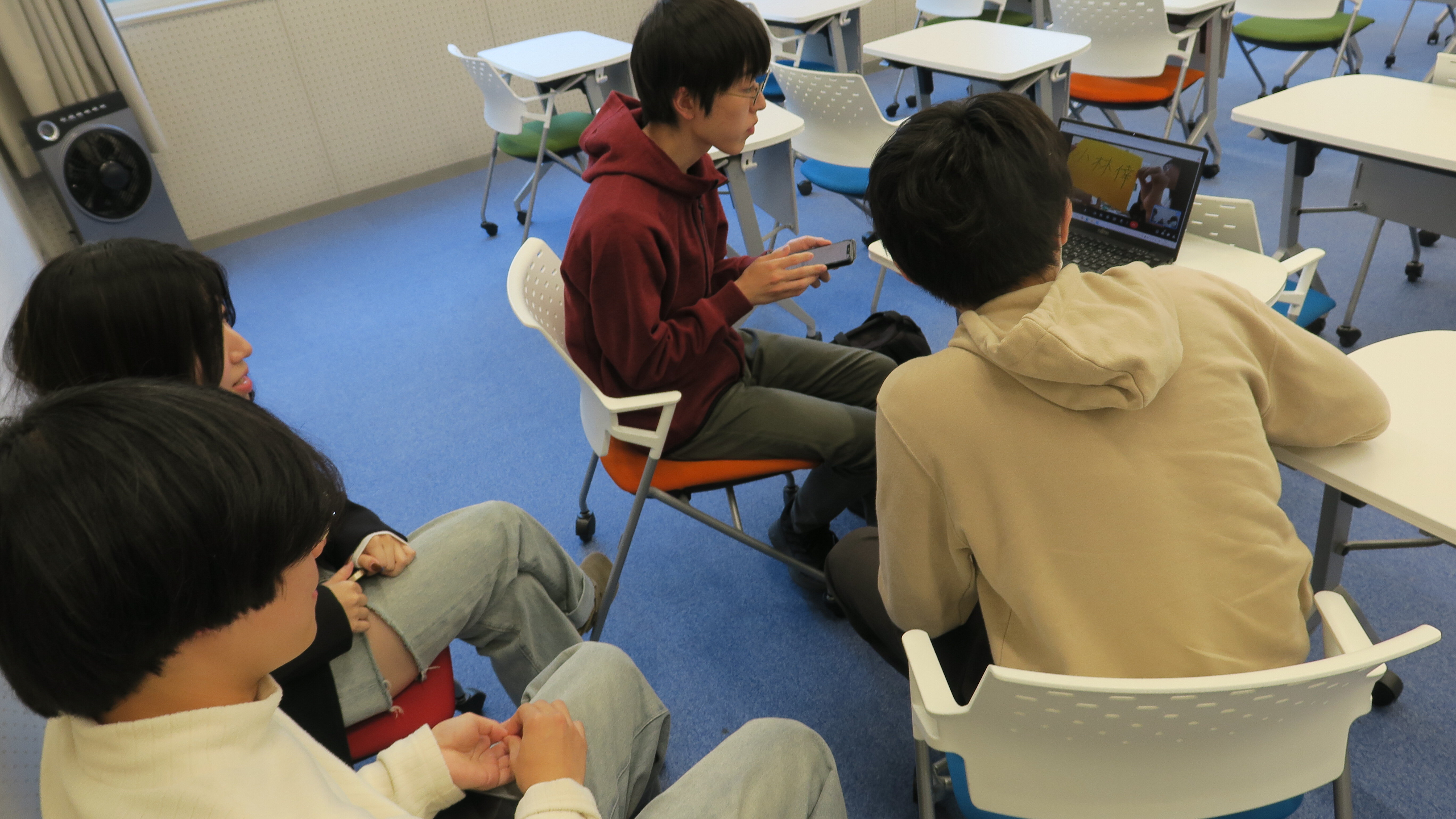 相手に中国語の発音を教えてもらいながら、片言で、自分の名前や好きなものを話し、それなりに伝わると、相手側から大歓声が聞こえてきました。ネームプレートやスマホの画面を相手に見せて、中国語での表現の仕方を教えてもらったり、チャットをつかったりと、使える物や機能を自由に使いながら、自己紹介の仕方を教わりました。