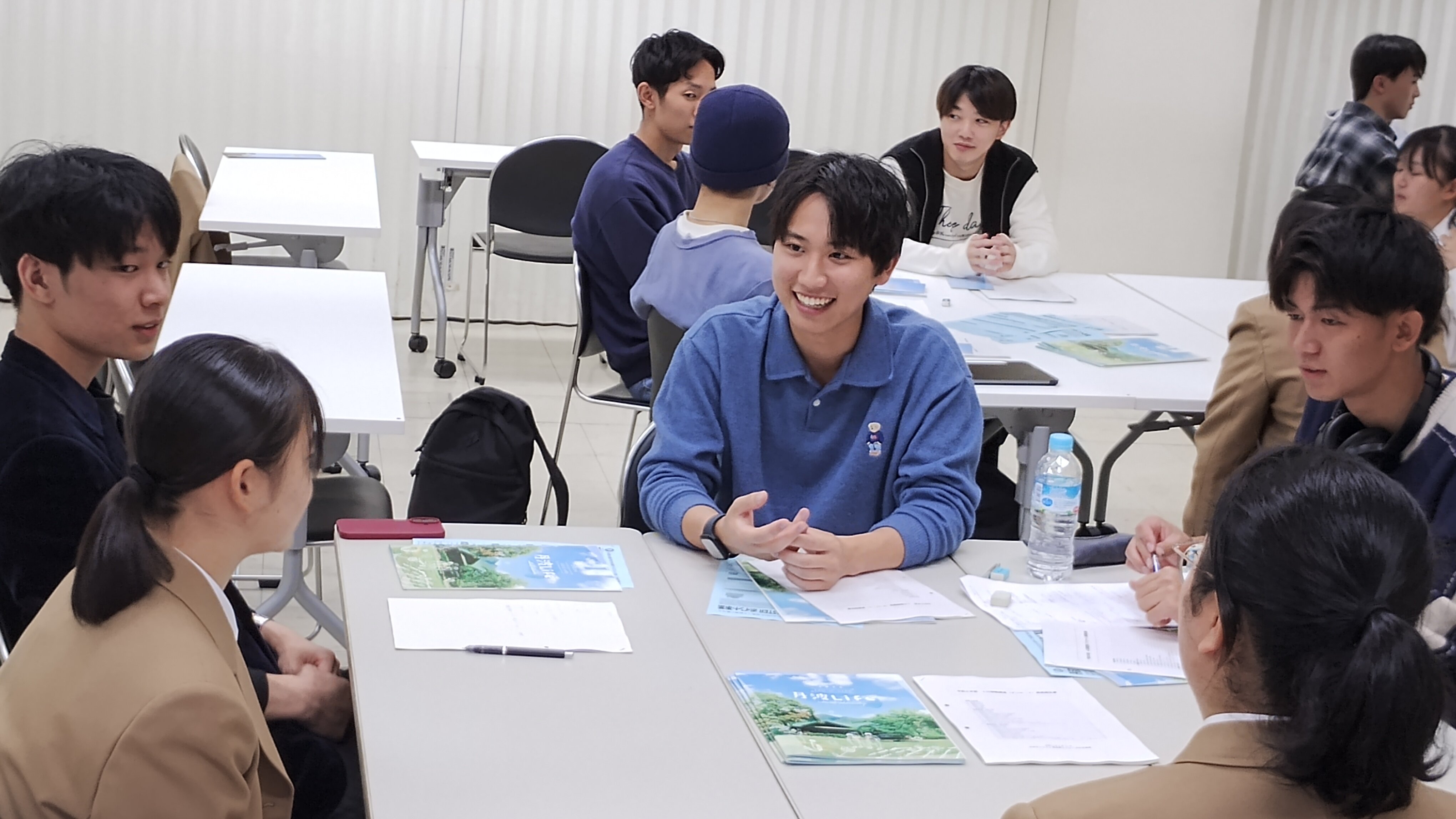 私たちは16名のゼミなのですが、3つの班に分かれて活動をしました。①班と②班は、丹波市の3高校と丹波市ふるさと定住促進課のご協力を得て、アンケート調査を設計しました。①班は、高校生の将来の移住・定住の意向を探るアンケート調査です。②班は、3高校の生徒さんの通学などの移動手段を探るアンケートです。③班は佐治スタジオ周辺の空き店舗をどのように活用できるかを探るアンケートの設計を行いました。