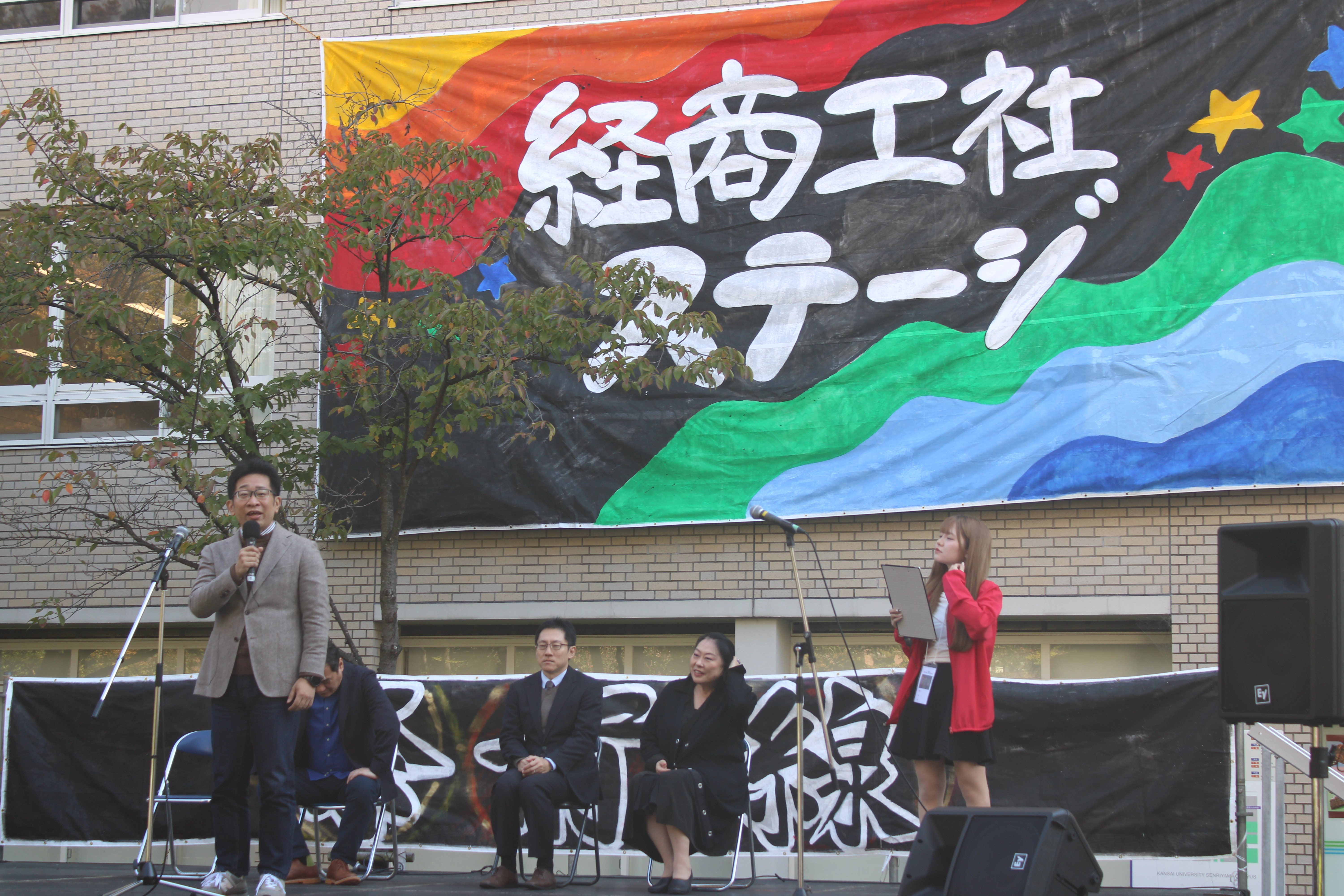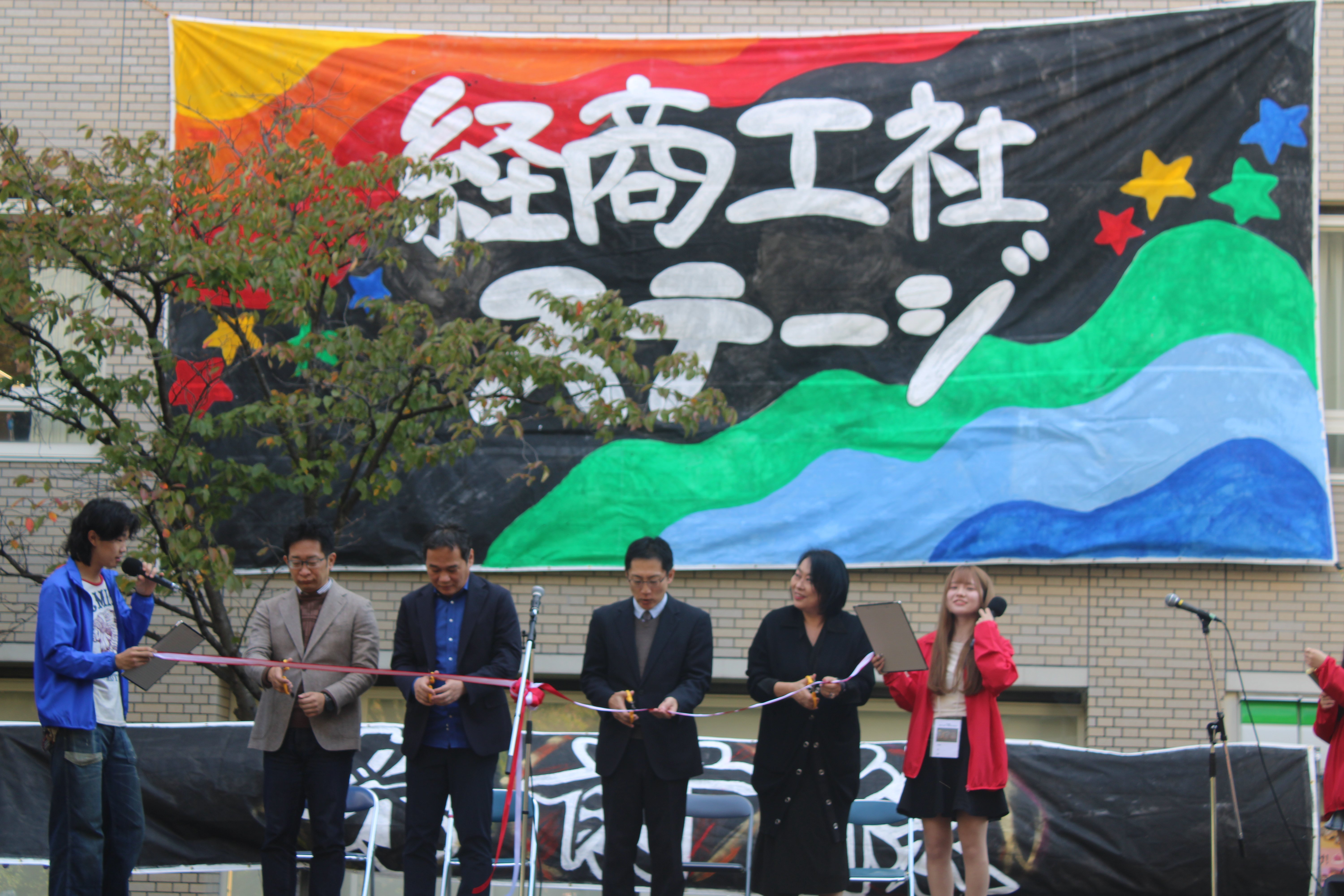 第2学舎前の経商工社ステージのオープニングセレモニーでは、経済学部長が挨拶を行い、テープカットをもって華やかに開幕の口火が切られました。