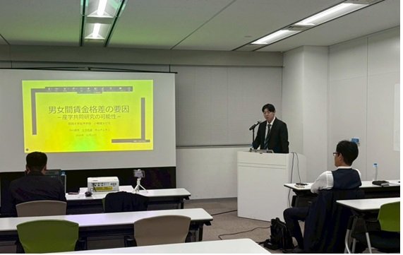 小嶋健太ゼミの学生(4年次生 大平皓資さん)が、吹田市議会議員の石川勝様が代表を務める日本政経会(J-PANDE)の定例会にて、研究成果を発表しました。大平さんたちのグループは、ある企業様からご提供いただいた社員の方々の人事データを用いて、企業内に存在する男女間賃金格差の要因を統計的に明らかにしました。