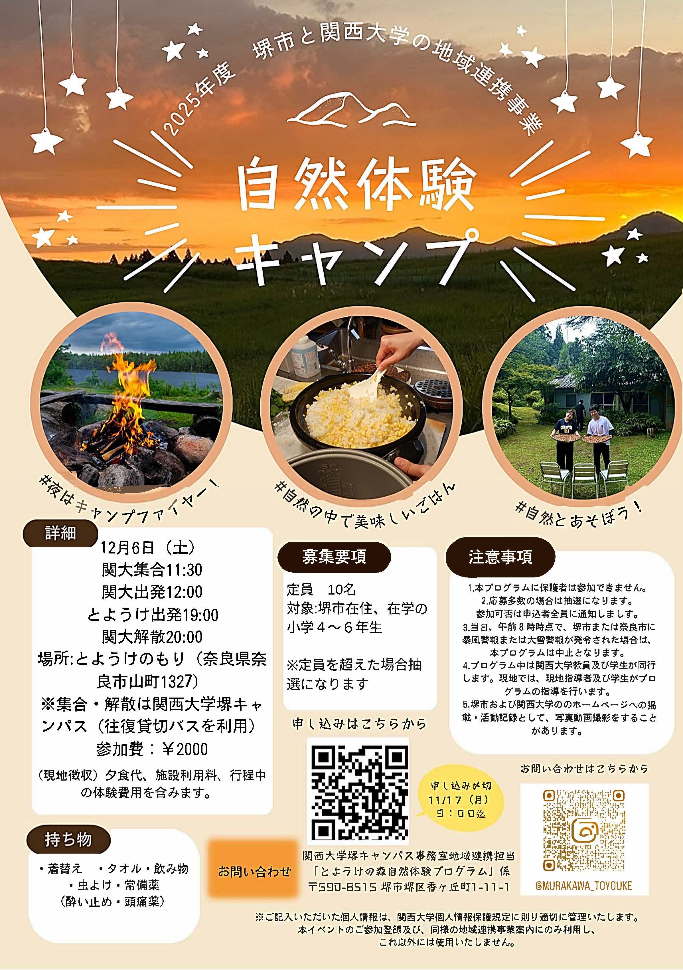 堺市と関西大学との地域連携事業の一環として、「自然体験キャンプ」を開催いたします。