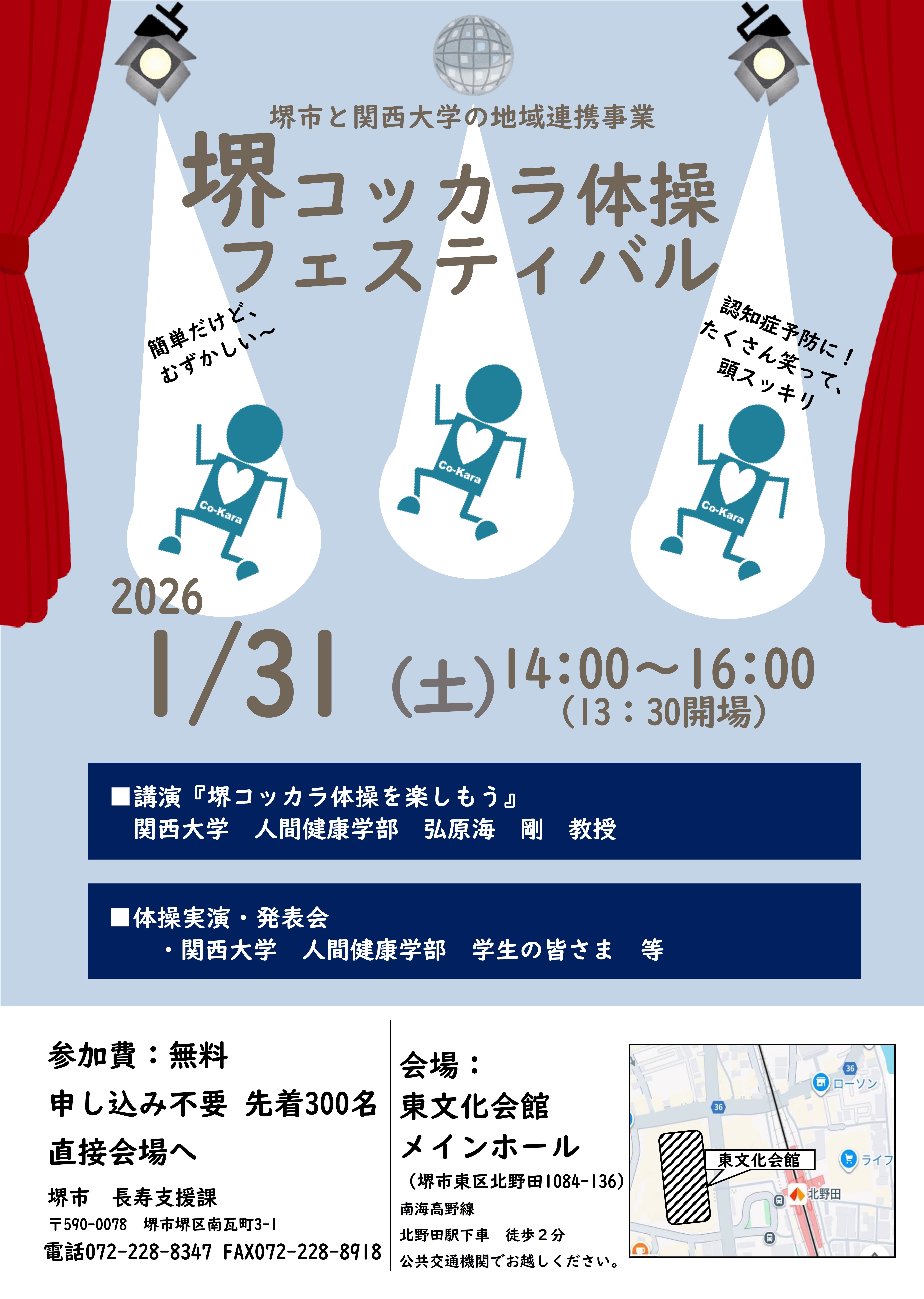 堺市と関西大学との地域連携事業の一環として、"堺コッカラ体操フェスティバル"を開催します。認知症予防のために考案された簡単だけどむずかしい「コッカラ体操」。たくさん笑って、頭スッキリしましょう。