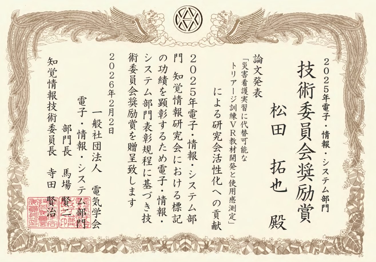 松田拓也,三田裕大,中村宏,長谷海平,林武文:災害看護実習に代替可能なトリアージ訓練VR教材開発と使用感測定,電気学会研究会資料(知覚情報研究会),PI-25-037,pp.7-12(2025年9月)