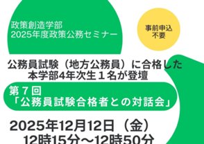 講座・講演会2025.12.04第7回政策公務セミナー「公務員試験合格者(地方公務員)との対話会」開催のお知らせ 2025年12月12日(金)