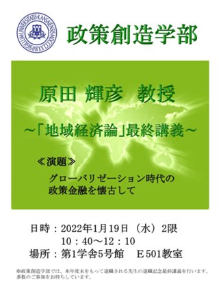 政策創造学部では、2021年度末をもって退職される原田 輝彦 教授の最終講義を以下のとおり開催いたします。
