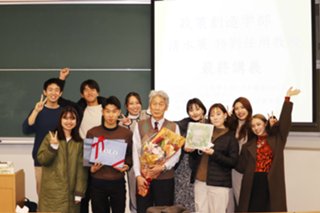優しい人柄で、多くの学生から慕われていた清水教授。学生をはじめ、この日駆けつけた卒業生や教職員らに見守られるなか、学生から贈られた花束・記念品を微笑みながら受け取り、「これからの時代は、政策創造の「創造」、つまりクリエイトすることが1番大事な力となります。中村医師のように、今までと違った発想で、現場が本当に必要ものは何か、しっかり目を凝らして耳をすませて見極めていくことが重要です。そのために充実した4年間の学生生活を過ごしてください」と言葉を贈りました。