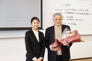 講演後は、ゼミ生からの花束を微笑みながら受け取り、「学生の皆さん、どうか志と誠実さ持って、これからの人生を過ごしてください」と力強いメッセージを贈りました。