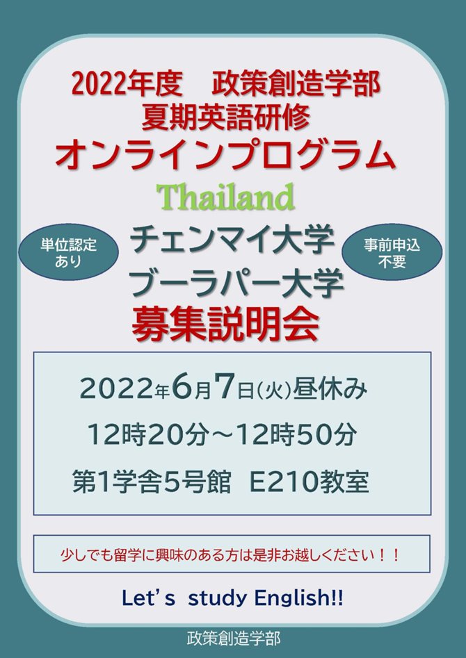 政策創造学部では、チェンマイ大学およびブーラパー大学(タイ)と連携して、