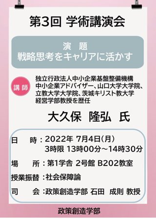 第3回 学術講演会開催のお知らせ(独立行政法人中小企業基盤整備機構中小企業アドバイザー 大久保 隆弘 氏)2022年7月4日(月)