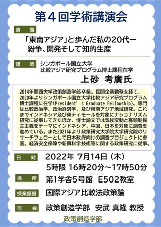 第4回 学術講演会開催のお知らせ(シンガポール国立大学 比較アジア研究プログラム博士課程在学 上砂 考廣 氏)2022年7月14日(木)