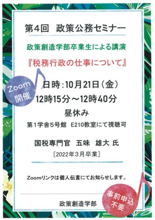 第4回政策公務セミナー「政策創造学部卒業生による講演」開催(オンライン)のお知らせ 2022年10月21日(金)