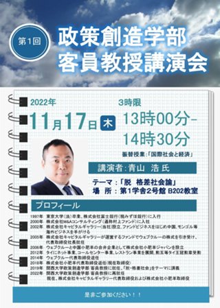 政策創造学部では、第1回 客員教授講演会を下記のとおり開催します。