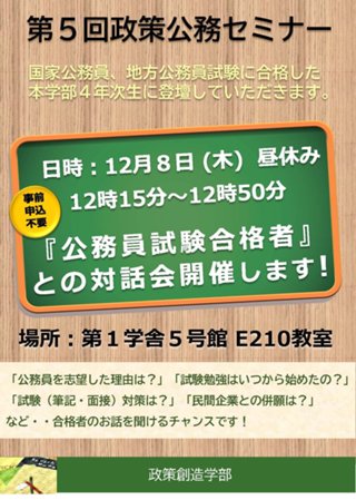 第5回政策公務セミナー「公務員試験合格者との対話会」を下記のとおり開催します。