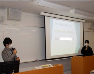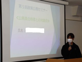 12月8日(木)、第5回政策公務セミナー「公務員試験合格との対話会」を開催しました。今年度は、国家公務員試験合格者として、本学部4年次生1名にご協力いただき、公務員を志望した理由や公務員試験対策についてご説明いただきました。
