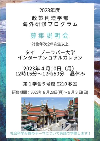 以下の通り、在外社会科学研究<タイ・ブーラパー大学>についての募集説明会を開催致します。興味のある方は是非ご参加ください。