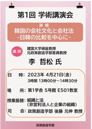 第1回 学術講演会開催のお知らせ(講師:建国大学碩座教授、元政策創造学部客員教授 李 哲松 氏)2023年4月21(金)