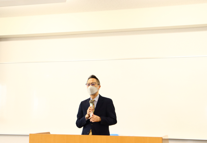 岡本学部長から「学部にとどまらず、今後も引き続き、大学全体さらには社会全体で活躍をしていって欲しい」と学生へ激励の言葉を贈りました。