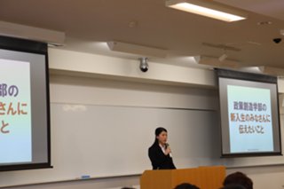 さらに、政策創造学部在学生(4年次生)からは、政策創造学部での学びの特徴およびゼミ活動について、自身の実体験に基づき、「自分で情報収集を行い、大学生活で誇れることを見つけて欲しい」と新入生に語りかけました。