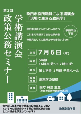 第3回政策公務セミナー 吹田市職員による講演会「現場で生きる政策学」開催のお知らせ 2023年7月6日(木)