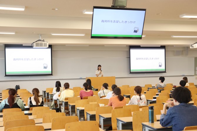 講演の後半には、採用1年目の裁判所職員の方から、実際に働いてみて感じたことや公務員試験の体験談、裁判所職員を目指したきっかけ等をご説明いただきました。