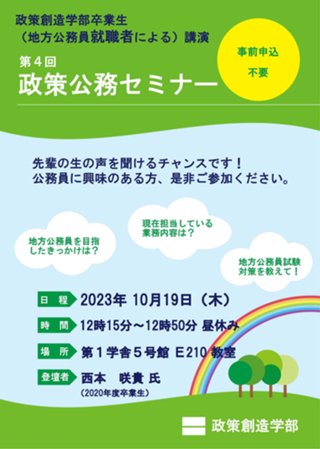 第4回政策公務セミナー「政策創造学部卒業生(地方公務員就職者)による講演」開催のお知らせ 2023年10月19日(木)