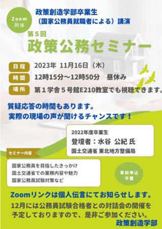第5回政策公務セミナー「政策創造学部卒業生(国家公務員就職者)による講演」の(Zoom)開催のお知らせ 2023年11月16日(木)