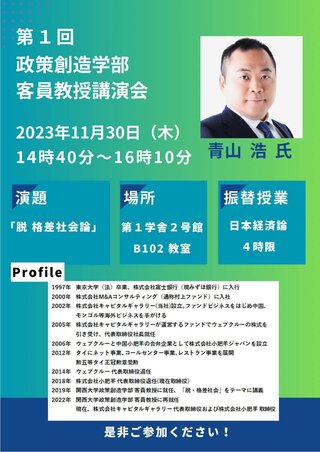 第1回 客員教授講演会開催のお知らせ(株式会社キャピタルギャラリー 代表取締役、 株式会社小肥羊 取締役 青山 浩 氏)2023年11月30日(木)