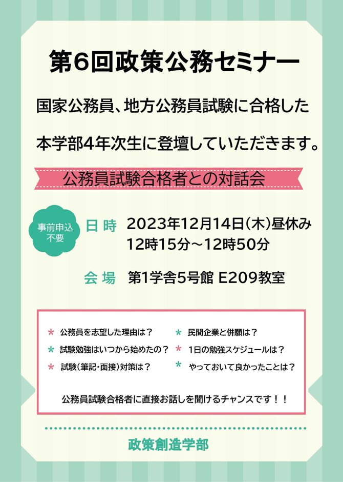 第6回政策公務セミナー「公務員試験合格者との対話会」開催のお知らせ 2023年12月14日(木)