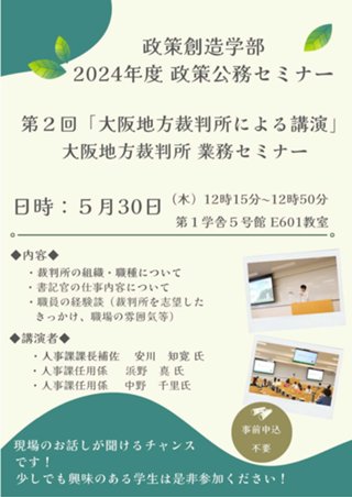 第2回政策公務セミナー「大阪地方裁判所 業務セミナー」開催のお知らせ 5月30日(木)