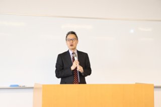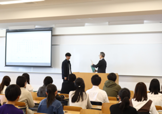 岡本学部長から「成績優秀者に選出されたことを誇りに思ってください。また、数字に表れない学びも深めていってください」と学生へ激励の言葉を贈りました。
