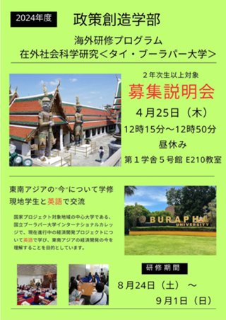 2024年度 在外社会科学研究<タイ・ブーラパー大学インターナショナルカレッジ>募集説明会開催のお知らせ