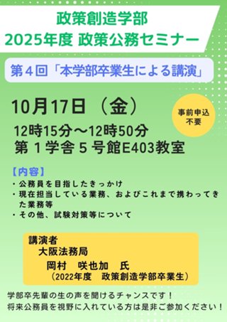 第4回政策公務セミナー「本学部卒業生による講演」のお知らせ(10月17日(金)昼休み)