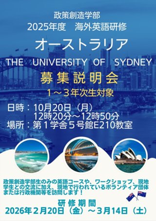 2025年度 海外英語研修<オーストラリア・シドニー大学>募集説明会を開催します(10月20日(月)昼休み)
