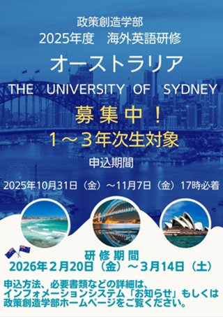[政策創造学部生限定]2025年度 海外英語研修 <オーストラリア・シドニー大学>参加者募集のご案内