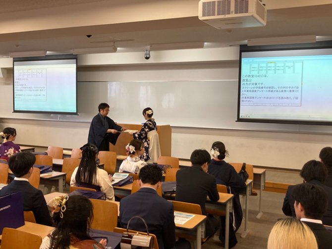 中央体育館にて大学全体の式典後、各ゼミに分かれて卒業証書授与式を行いました。