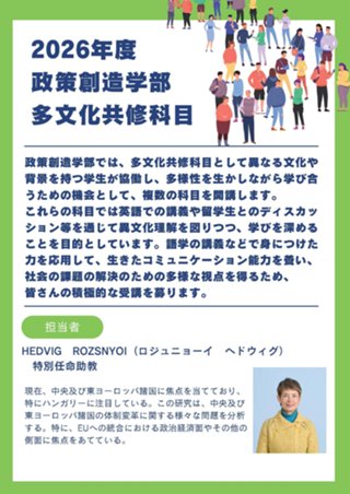 政策創造学部では、添付のとおり、2026年度「多文化共修科目」を開講いたします。 学部生の皆さんの、積極的な履修を期待します。以 上