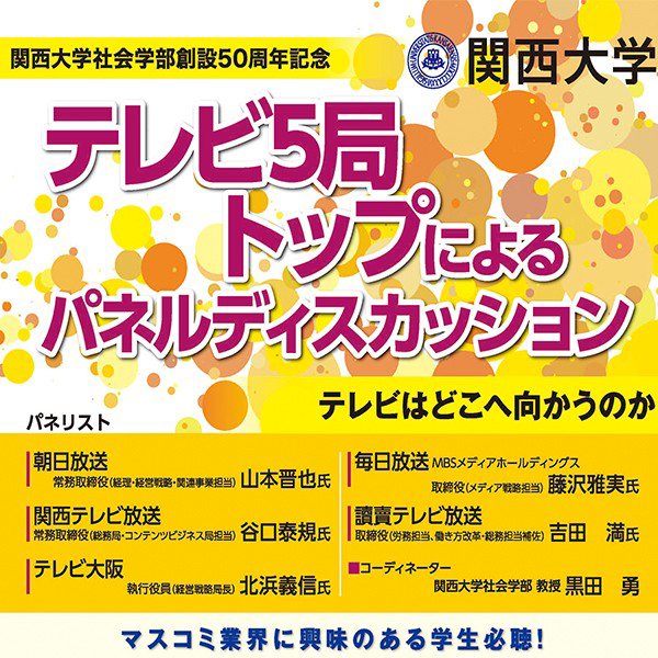 関西大学社会学部創設50周年を記念して、テレビ5局のトップが本学梅田キャンパスに集まり、「テレビはどこへ向かうのか」をテーマにパネルディスカッションを行います。テレビ5局が一同にそろう前例のない催しです。