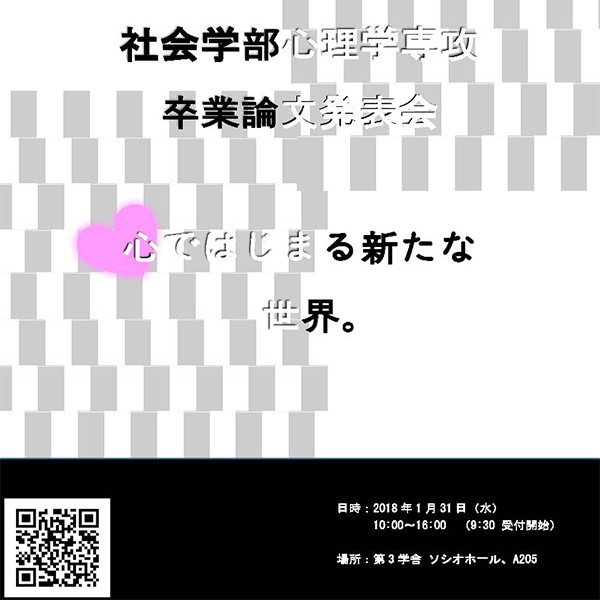 心理学専攻では毎年1月末に卒業論文発表会を開いており,今年は第8回目になります。この発表会は口頭発表とポスター発表があり,各ゼミから数名の学生が卒業論文を発表します。今年のテーマは「心ではじまる新たな世界」で,下記の要領で開催いたします。どなたでもご参加いただけ,関心のある発表やポスターだけ聞いていただいたり,見ていただいても結構ですので,気軽にお越しください。