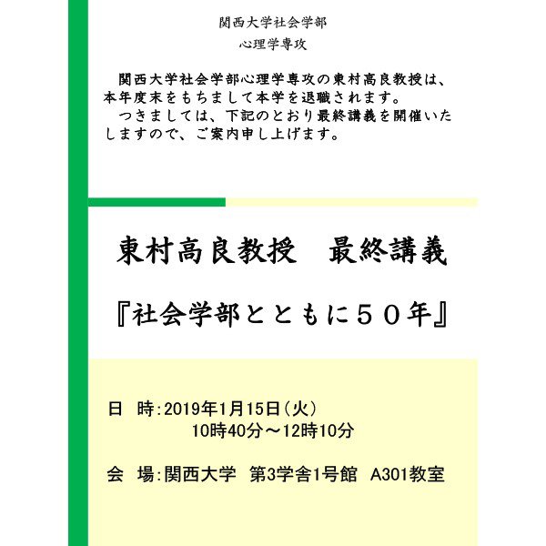 東村高良先生におかれましては、長きにわたり関西大学において教鞭をとってこられましたが、このたび2019年3月31日をもちまして本学をご退職されます。