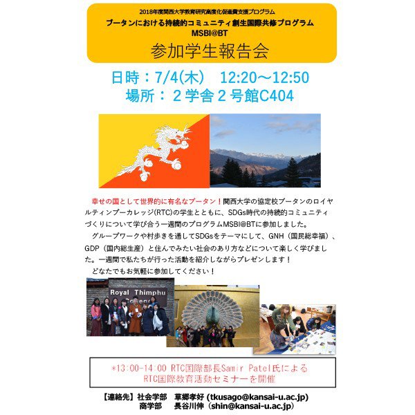 ブータンのロイヤルティンプーカレッジ(RTC:本学協定校)と共同で取り組んだ「持続的コミュニティ創生国際共修プログラム(2018年度関西大学教育研究高度化促進費)」の参加学生による報告会を開催します。