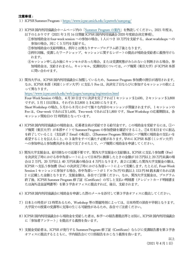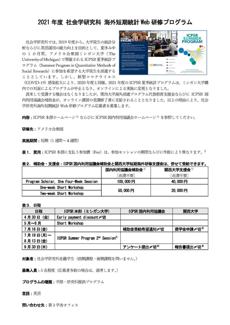 渡米して受講する機会はなくなりましたが、関西大学海外派遣プログラム代替教育支援金ならびにICPSR国内利用協議会補助金が、オンライン講習の受講修了者に支給されることとなりました。以上の理由により、社会学研究科海外短期統計Web研修プログラム応募者を募集します。