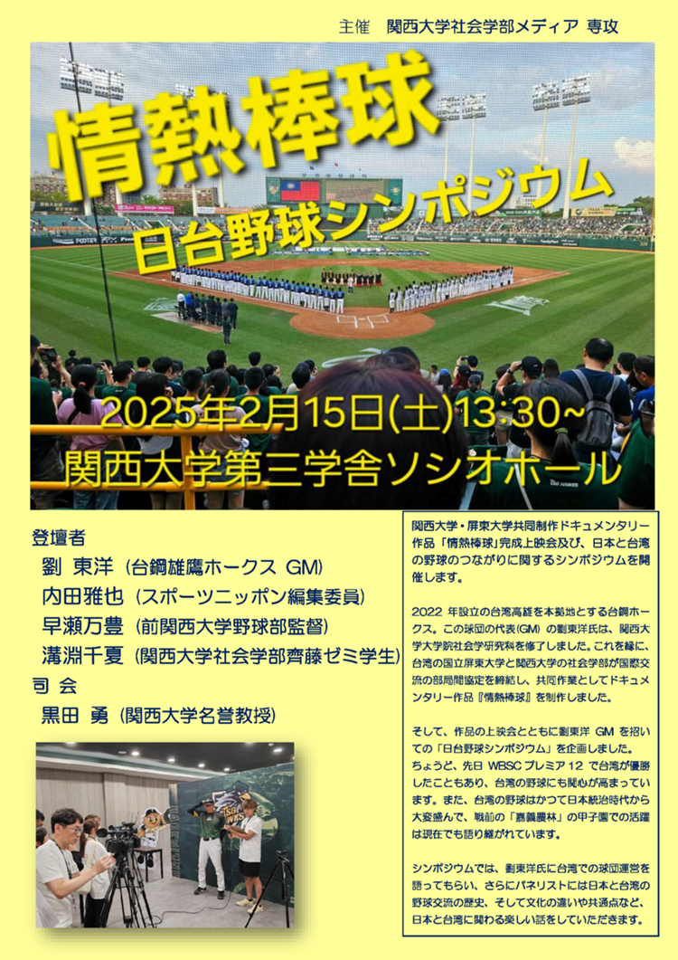 2025年2月15日(土)13:30~、千里山キャンパス第3学舎ソシオホールで作品の上映会とともに、劉東洋GMを招いての「日台野球シンポジウム」を開催します。